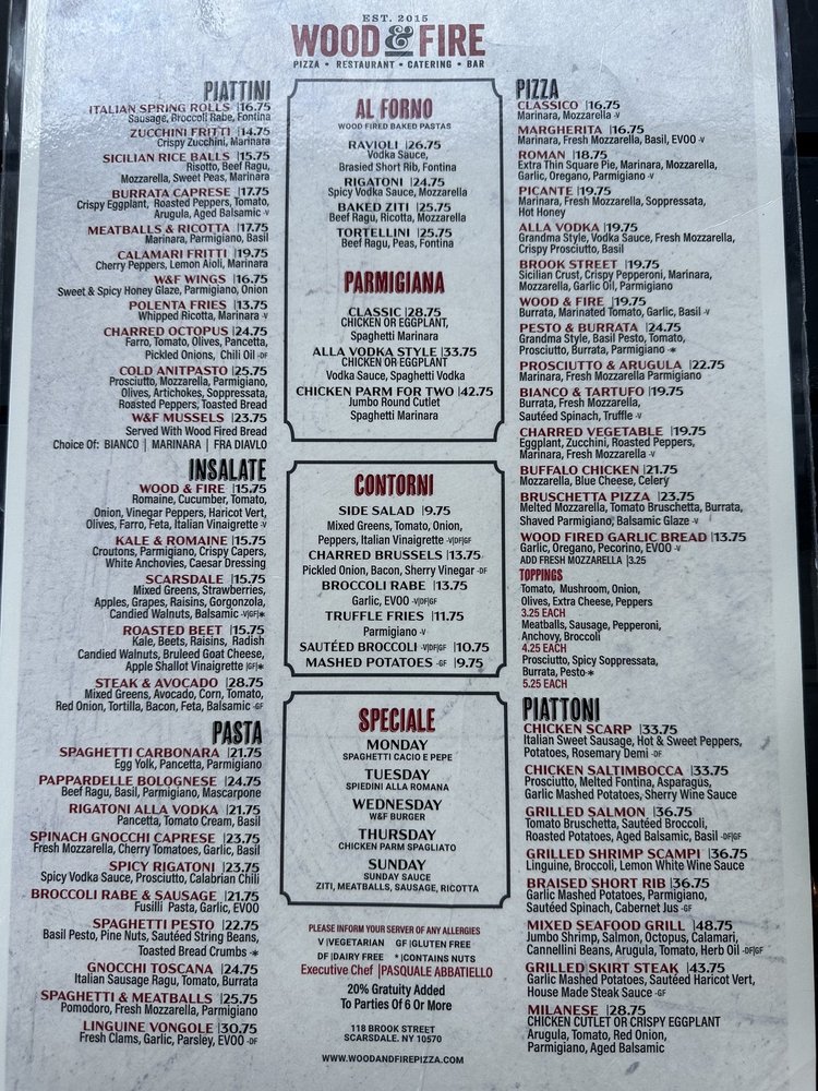 Welcome to Wood & Fire, where Italian cuisine meets a casual yet trendy atmosphere. Nestled in the heart of Scarsdale, New York, this delightful establishment is more than just a restaurant; it's a gastronomic haven. Specializing in mouthwatering pizzas and elevated bar favorites, Wood & Fire is your go-to spot for everything from casual weeknight dinners to celebratory gatherings.